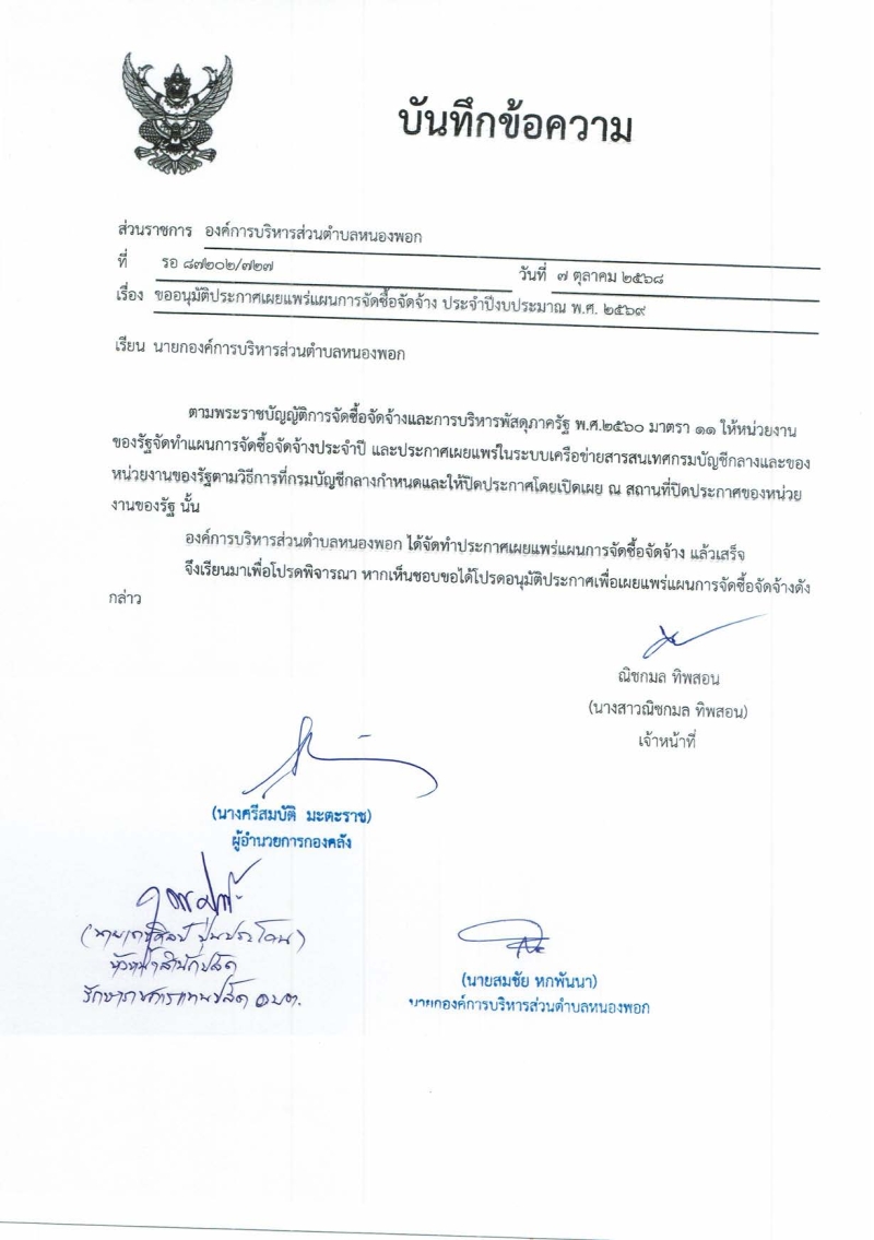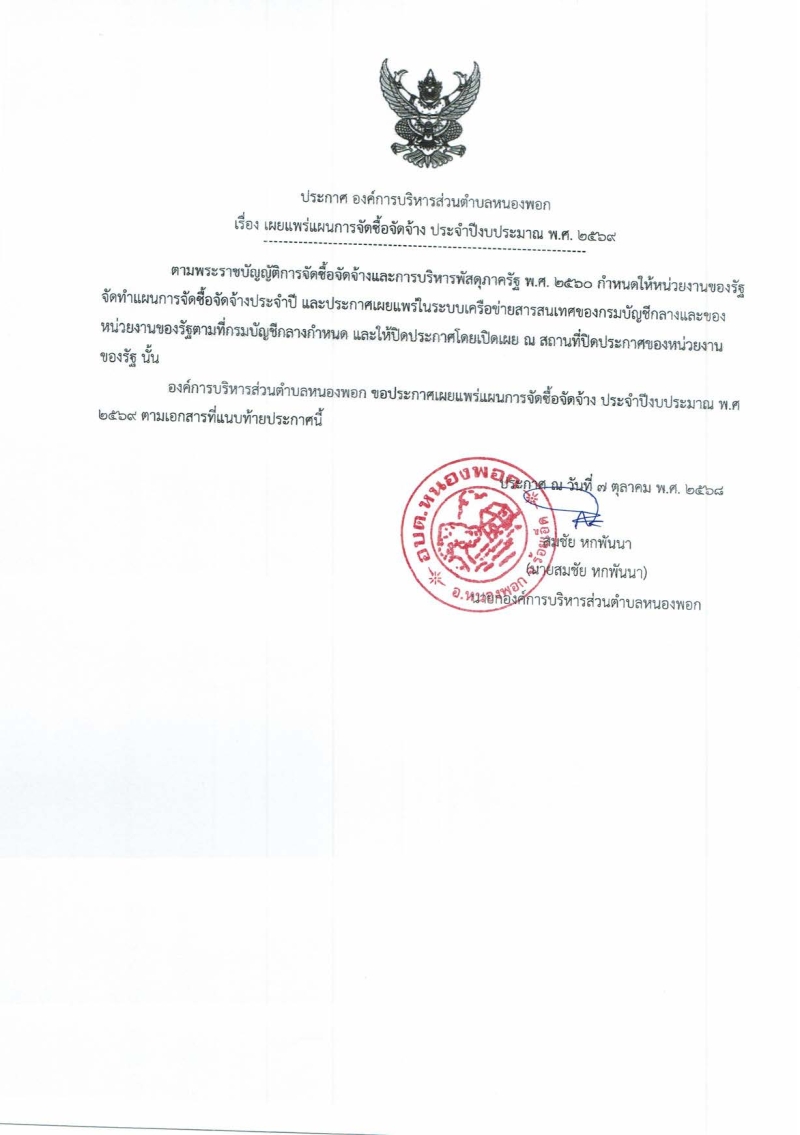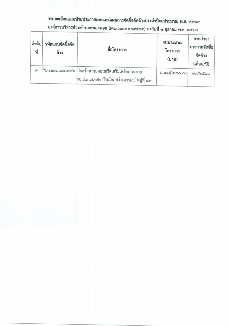 ประกาศองค์การบริหารส่วนตำบลหนองพอก เรื่อง เผยแพร่แผนการจัดซื้อจัดจ้าง ประจำปี 2569 โครงการก่อสร้างถนน คสล. ถนนสาย รอ.ถ.185-12 บ้านโคกสว่างอารมณ์ หมู่ 12