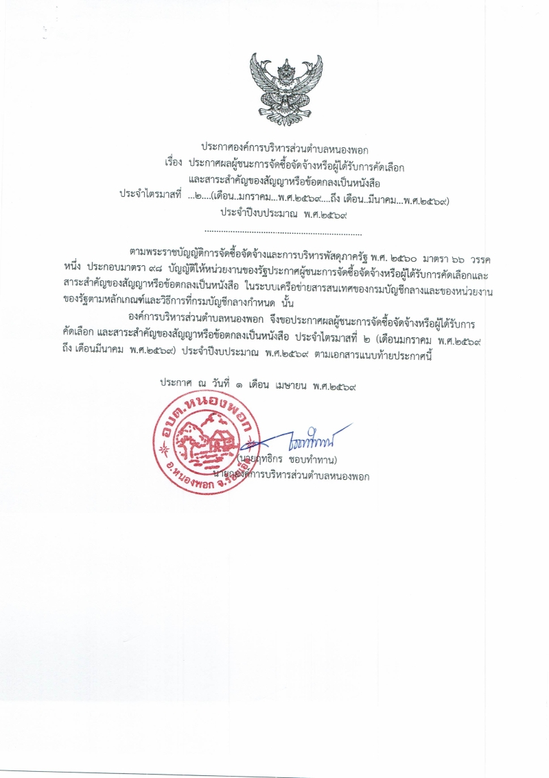ประกาศผลผู้ชนะการจัดซื้อจัดจ้างหรือผู้ได้รับคัดเลือก ประจำไตรมาสที่ 2 เดือน มกราคม 2569 ถึง เดือน มีนาคม 2569